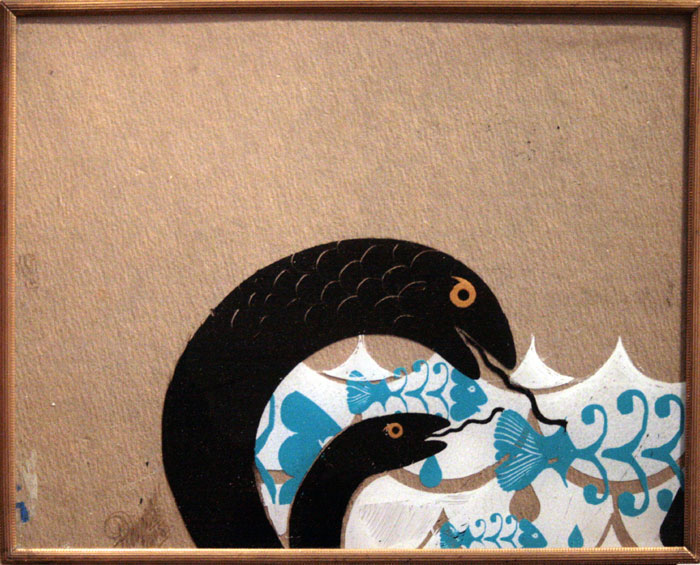 Snakes Eat Dead Fish acrylic on glass with college on panel 8"x11"