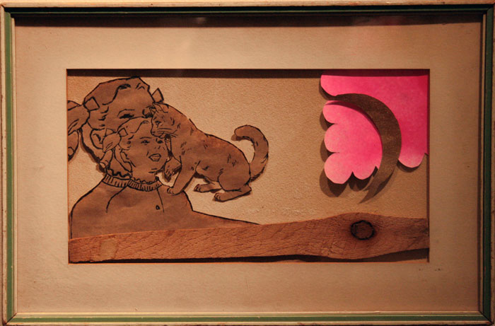 The Double-headed Feline Rapture of Lucy & The Sailor Bless craft paper, pen & ink, found balsa, gold foil, spray paint 11"x16"