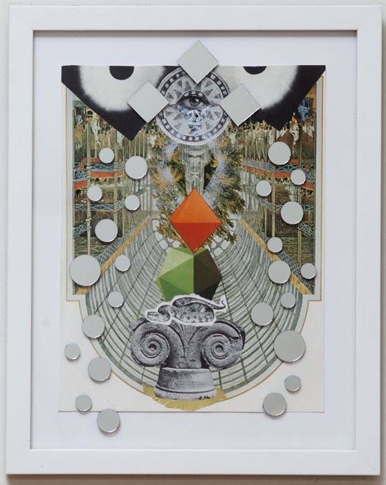 Josh Sachs - Auricle Oracle - paper, foil, plastic, glue, acrylic paint, die cut mirrors - 8.5 x 11