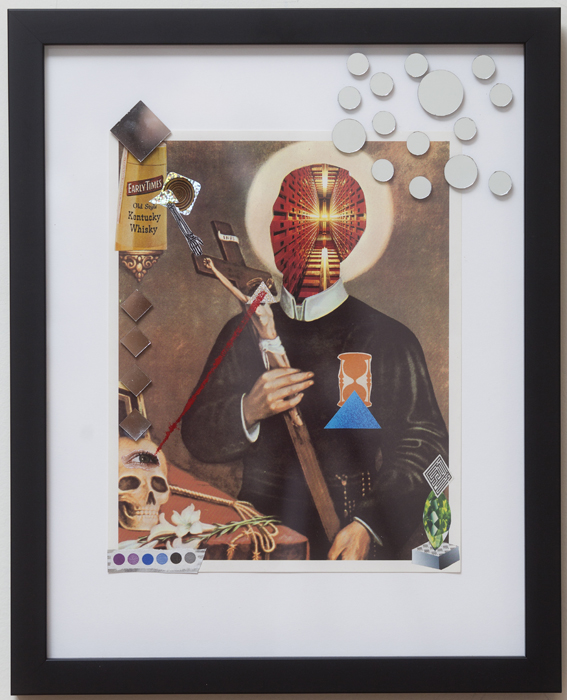 Josh Sachs - Early Times - paper, foil, plastic, glue, acrylic paint, die cut mirrors - 8.5 x 11 sold