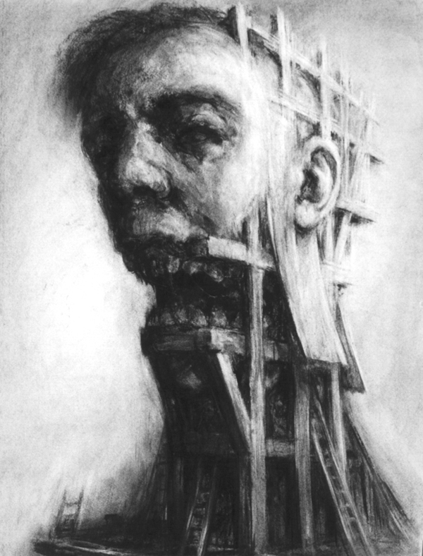 Paul Rumsey - "Scaffolding Head" - charcoal on paper - 30" x 22"