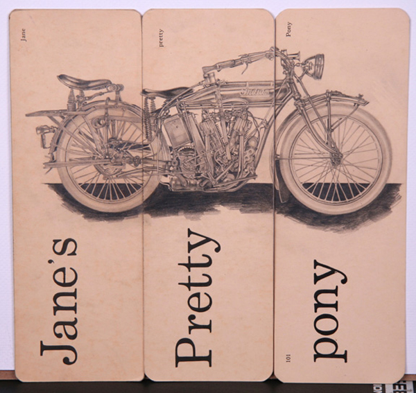 "Jane's Pretty Pony " - Graphite on vintage Dick & Jane flashcards - 20" x 20" framed