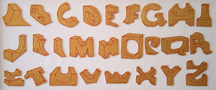 Ramp Alphabet - Gold acrylic & thread on gessoed canvas - 10" x 20”