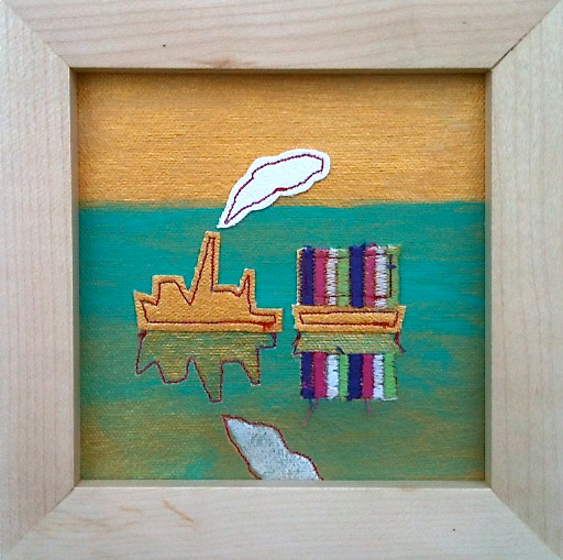 Small Tugboat - Gold acrylic & thread on gessoed canvas - 10" x 20”