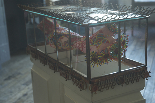 Ben Finer Making the sound of ashes or or mulch and the shape of crusted drought earth, and the touch of fingers, in love with the things they're conquered, finding twisted bodies doubly-broken and emptiness or joy only that much deeper a basin in which to dive-Dimentions Variable-Paper, tape, wood, brass, glass, beads, pins, acrylic paint |