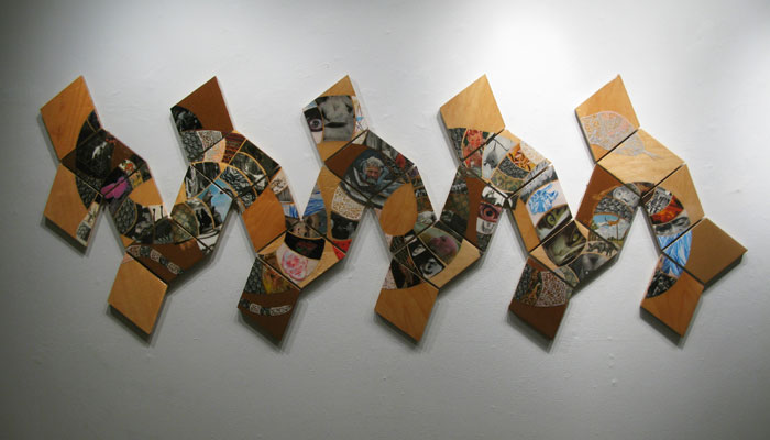 Kevin and Nina Long - Tunisnakeoneword - collage on wood - installation