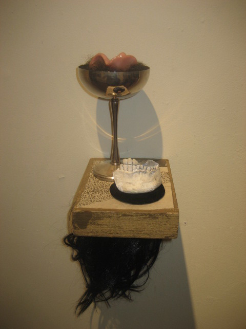 Carlucci Bencivenga "Cunnilingus Chalice and Bacon's Chin with Faux Spores on Shelf with Merkin" - wood, paint, silver, plaster, newsprint, beard, floam - appx 8" x 8" x 20"